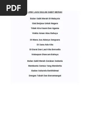 Bulan sabit merah di malaysiagiat berjasa untuk negaratidak kira kaum dan agamawaktu aman atau bahayadi mana jua adanya sengsaradi sana ada lagu bulan sabit merah. Lirik lagu bulan sabit merah bulan sabit merah di malaysia giat berjasa untuk negara ti ak kira kau!